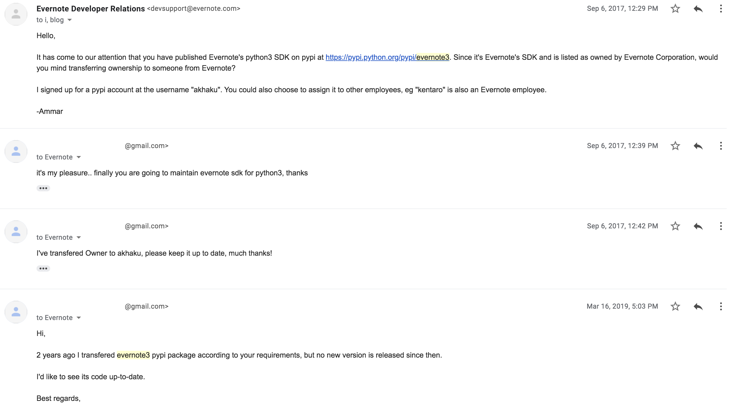 devsupport@evernote.com发邮件来说(大意):我们注意到了pypi上这个evernote3,你介意转移给Evernote吗 - 我在15分钟内转移完毕,并回邮件:希望你们能保持更新